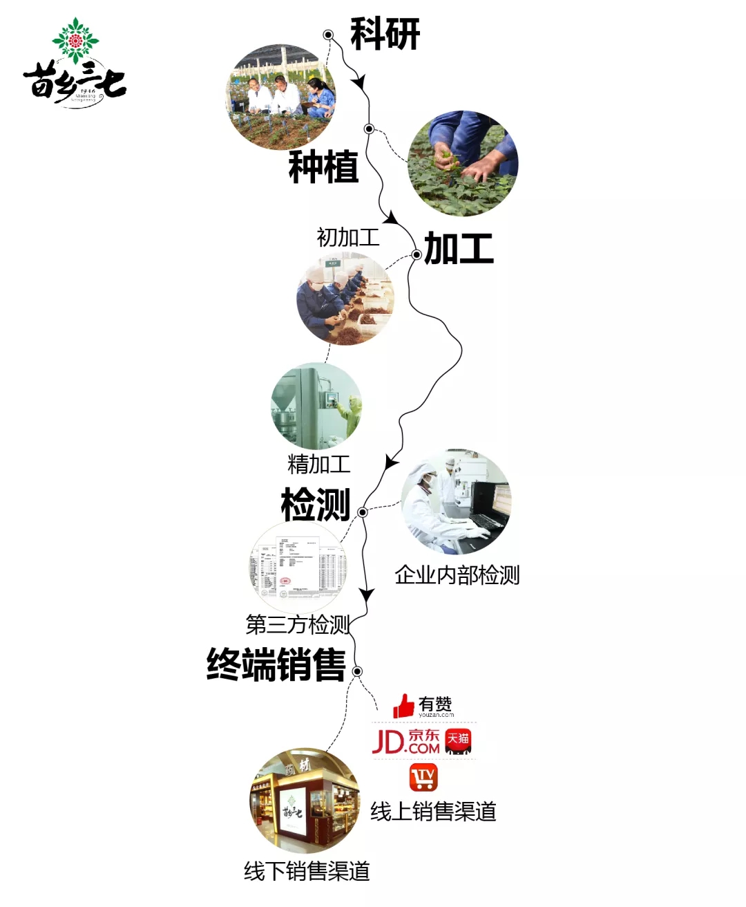 苗乡三七为保证三七产品品质,构建从科研、种植、加工、销售、服务为一体的全产业链,奠定做高品质三七的实业基础。