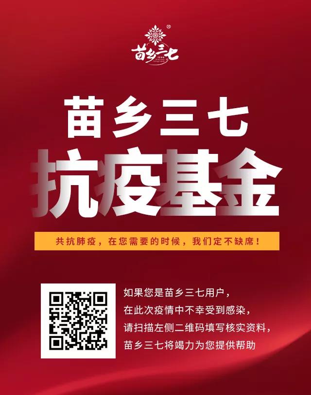 向防治疫情前线捐赠价值87万元三七产品的同时,苗乡三七成立150万元抗疫基金,将为此次疫情中不幸感染的苗乡三七用户提供专项帮助!