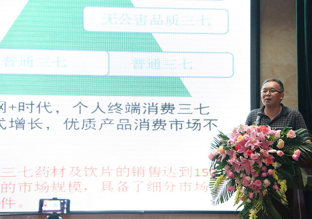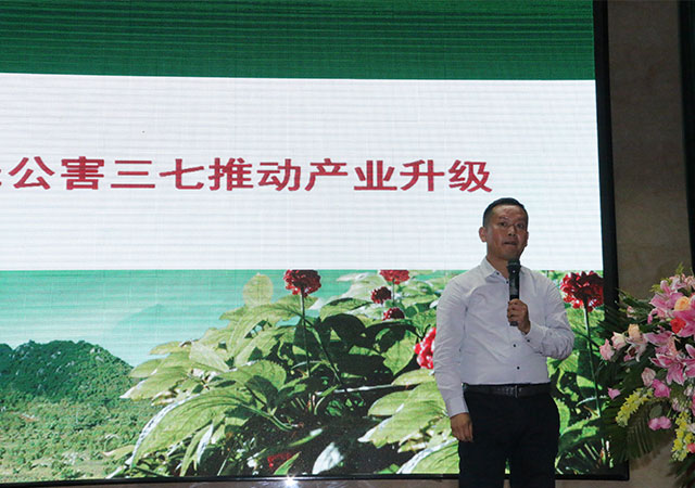 首先,文山州生物三七局副局长李保能对文山三七产业发展现状作了发言并表示,文山三七产业已成为云南生物医药产业中资源最丰厚、基础最扎实、前景最看好、市场最广阔的重要产业,在云南省生物医药产业中占据重要位置;更是文山州的重要支柱产业,在全州经济社会发展中发挥着重要作用,目前种植发展逐步规范,企业实力不断增强,构建了种植基地平台、工业平台、市场体系和科技创新体系,并相继制定和实施了《干制三七花》和《干制三七茎叶》标准,《中医药—三七种子种苗》1项道地药材国家标准,《无公害三七药材及饮片与重金属及有害元素的最大残留限量》1项中国中药协会团体标准,产业竞争力得到提升。但目前三七产业与“互联网+”深入不融合、未能充分借助互联网+有效整合三七全产业链、实现三七产业发展新业态、导致三七产业发展没有达到预期的目标和效果,希望大家能够抓住中医药发展的大好时机、文山三七作为六大产业之首、抓住它的道地性及神草功效的时机,随着三七知名度的提升、国家发展大健康产业的机遇,我们一定要克服资金及连作困难、克服三七市场不规范、业主交易不诚信的问题、克服跟风而上、三七价格大起大落等问题。希望大家共同维护文山三七的品质,让三七走出国门、走向世界,成为人类的健康伴侣。