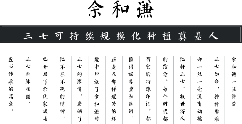 抗战胜利,余和谦辞去飞虎队后勤军酒厂技术员服务员,到文山马关农场一个种三七的亲戚家要了一衣兜红籽(三七种子),回到喜古乡,开始在自家土地里种植三七。