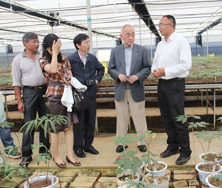 苗乡三七与中药全球化联盟合作中药全球化联盟主席、台湾中央研究院院士、美国耶鲁大学郑永齐教授(右二),自2007年以来三次对苗乡三七进行考察,2012年组织《微生态因子对三七生长和连作障碍的影响》并担任首席科学家,带领沈阳医科大学、中科院昆明植物所、文山三七研究院的团队在苗乡(文山)三七科技园通过微生物群落结构动态、化感物质分析及田间实验探讨三七连作障碍的机制。
